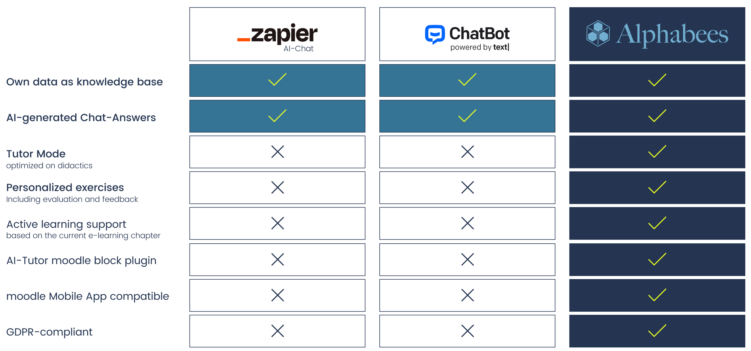 While AI chats only answer questions, the Alphabees Tutor actively supports learners throughout the course.